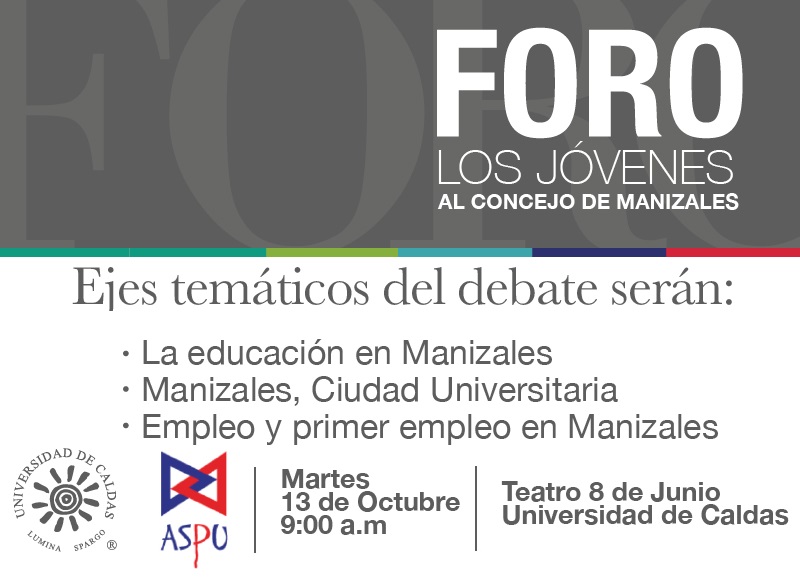 La Asociación Sindical de Profesores de la Universidad de Caldas (Aspu) invita al público en general al foro con los candidatos jóvenes al Concejo de Manizales.
