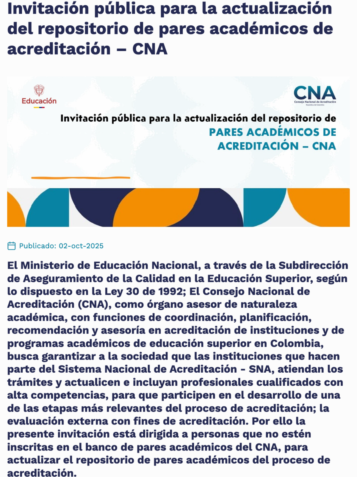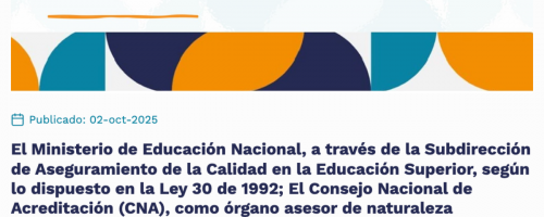 La convocatoria del Consejo Nacional de Acreditación (CNA) está dirigida a profesionales con formación de posgrado y experiencia docente superior a cinco años, interesados en hacer parte del repositorio de pares académicos de acreditación las inscripciones estará abierta hasta el 31 de octubre de 2025, y puede realizarse a través del enlace: