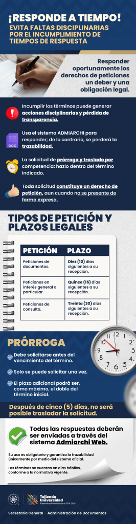 Desde la Secretaría General – Administración de Documentos se recuerda a la comunidad universitaria la importancia de responder oportunamente los derechos de petición, en cumplimiento de la normatividad vigente y como parte del compromiso con la transparencia y la responsabilidad institucional.