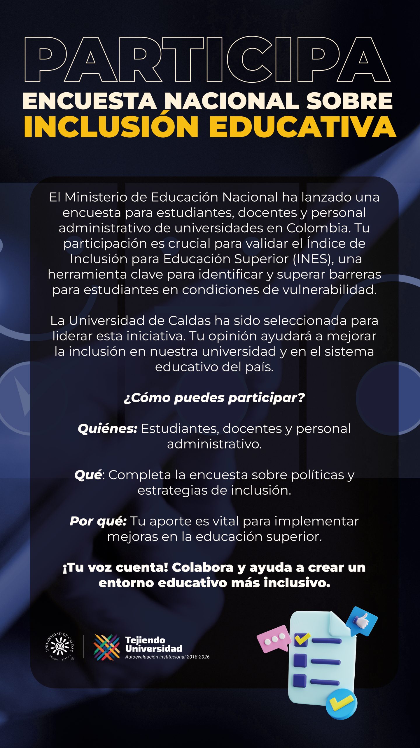 El Ministerio de Educación Nacional hace un llamado a todos los miembros de la comunidad universitaria, incluyendo estudiantes, docentes y personal administrativo, a participar activamente en esta encuesta. Su colaboración es esencial para evaluar la percepción general sobre las políticas y estrategias de inclusión en la educación superior. Los resultados obtenidos proporcionarán una base sólida para implementar mejoras significativas en las instituciones educativas del país.