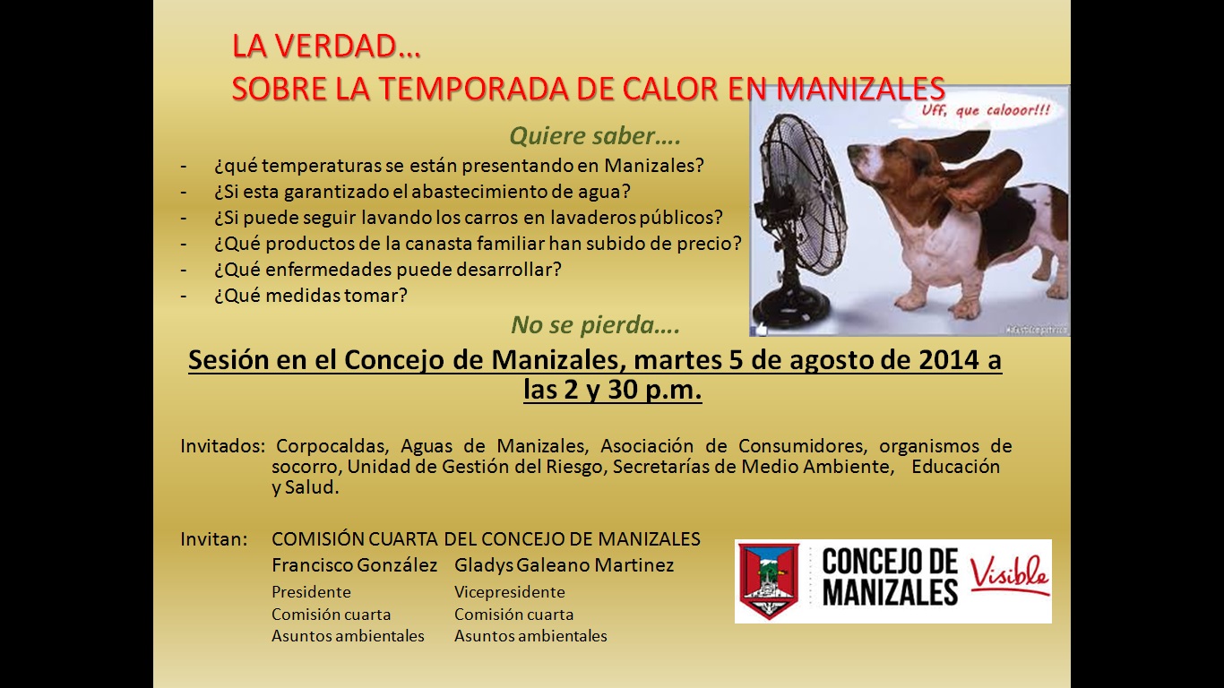El Concejo de Manizales invita a toda la comunidad universitaria y la ciudadanía en general para que participen de la sesión plenaria que se realizará este martes 5 de agosto del 2014 donde se hablará acerca de La verdad de la temporada de calor en Manizales.