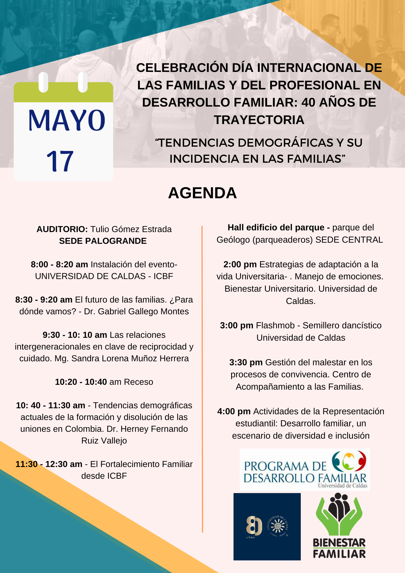 Para esta oportunidad se presentarán una serie de conferencias y charlas en torno al tema central “Tendencias demográficas y su incidencia en las familias”, donde se contará con la participación de expertos en el área y del Instituto Colombiano de Bienestar Familiar.
