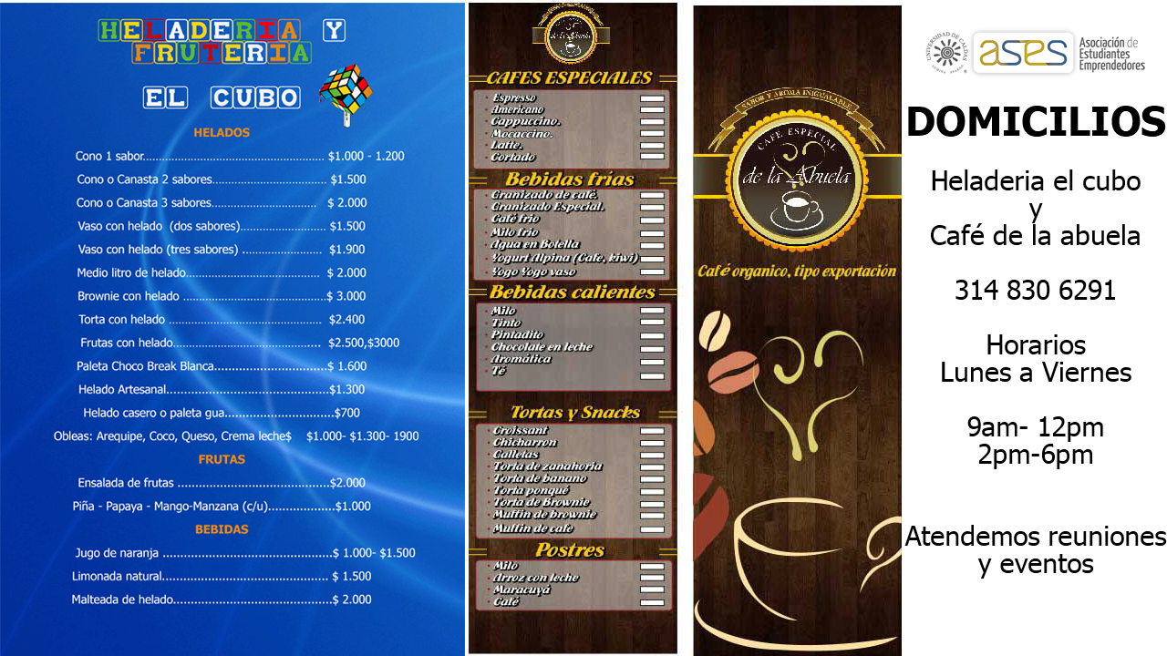 La Asociación de Estudiantes Emprendedores (Ases) de la Universidad de Caldas invita a todos los docentes, funcionarios y administrativos a disfrutar del nuevo servicio a domicilio de la Heladería el Cubo y el Café de la Abuela.