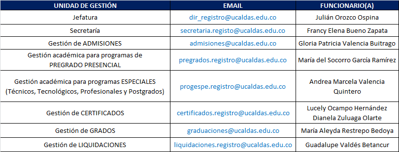 Con el fin de brindar mejores servicios desde la Oficina de Admisiones y Registro Académico de la Universidad de Caldas, dicho despacho informa que a partir de la fecha todas las comunicaciones vía correo electrónico se tramitarán de acuerdo con la temática que atiende cada unidad de gestión.