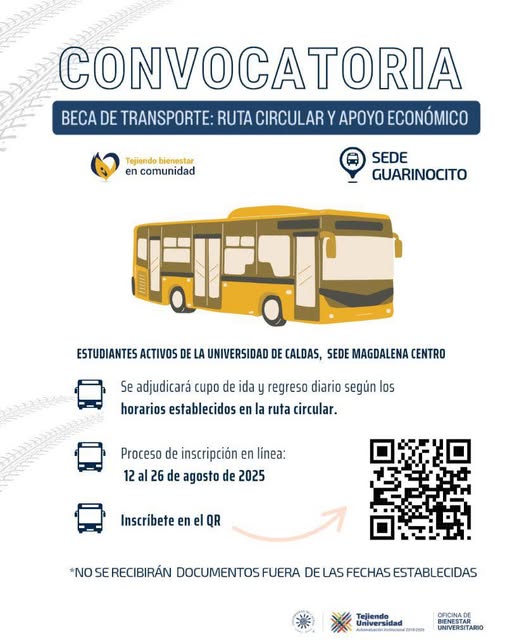 ¡Atención estudiantes de la Sede La Paz del Magdalena Centro!. La Universidad de Caldas, a través de la Oficina de Bienestar Universitario, anuncia la apertura de inscripciones para la Beca de Transporte: Ruta Circular y Apoyo Económico correspondiente al semestre 2025-2.