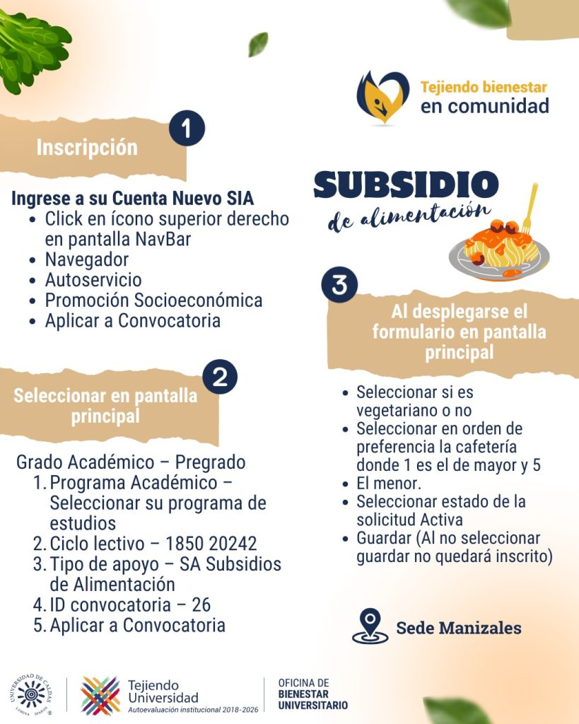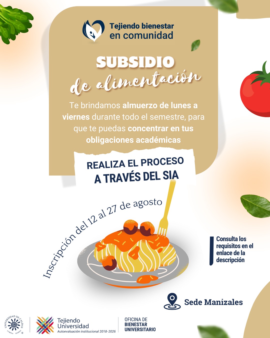La Oficina de Bienestar Universitario ha anunciado la apertura de la convocatoria para el Subsidio de Alimentación correspondiente al segundo semestre. Este beneficio está dirigido a estudiantes de programas regulares ubicados en la zona urbana de Manizales. En las regiones también tendremos el beneficio, próximamente se abrirán las convocatorias.