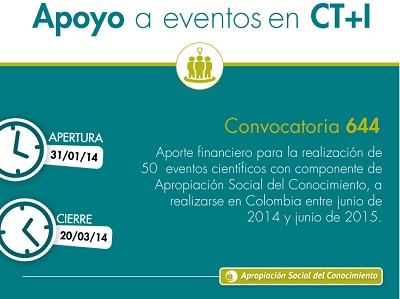 El 20 de marzo del 2014 finaliza el plazo para inscribirse al proyecto de Colciencias que pretende apoyar eventos nacionales e internacionales de carácter científico, tecnológico e innovador que integren un componente de apropiación social del conocimiento.