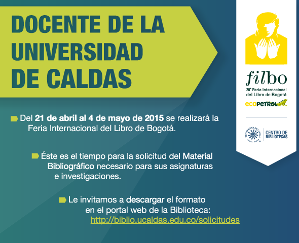 El Centro de Bibliotecas de la Universidad de Caldas invita a los docentes de la Institución a participar en la Feria Internacional del Libro de Bogotá que se realizará del 21 de abril al 4 de mayo del 2015.