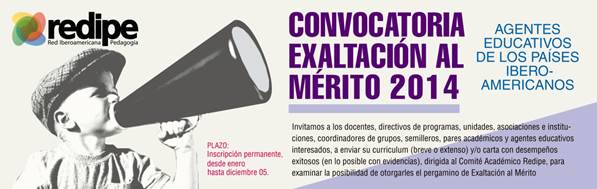 La Red Iberoamericana de Pedagogía (Redipe) abre la convocatoria Exaltación al mérito 2014: docentes que educan, dirigida a todos los docentes, directivos, funcionarios y otros agentes educativos de todos los niveles de educación formal y no formal que consideren que merecen exaltación.