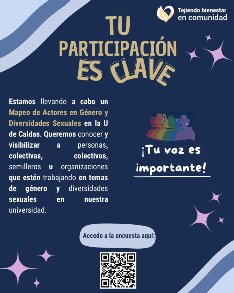 Como parte de esta labor, se invita a los estudiantes, docentes y personal administrativo a participar en la encuesta de caracterización para el mapeo de actores en temas de género y diversidades sexuales. Esta iniciativa busca identificar a personas sexualmente diversas, con identidades de género divergentes o que formen parte de colectivos y organizaciones relacionados con estos temas, con el fin de articular acciones que promuevan un entorno inclusivo y equitativo.