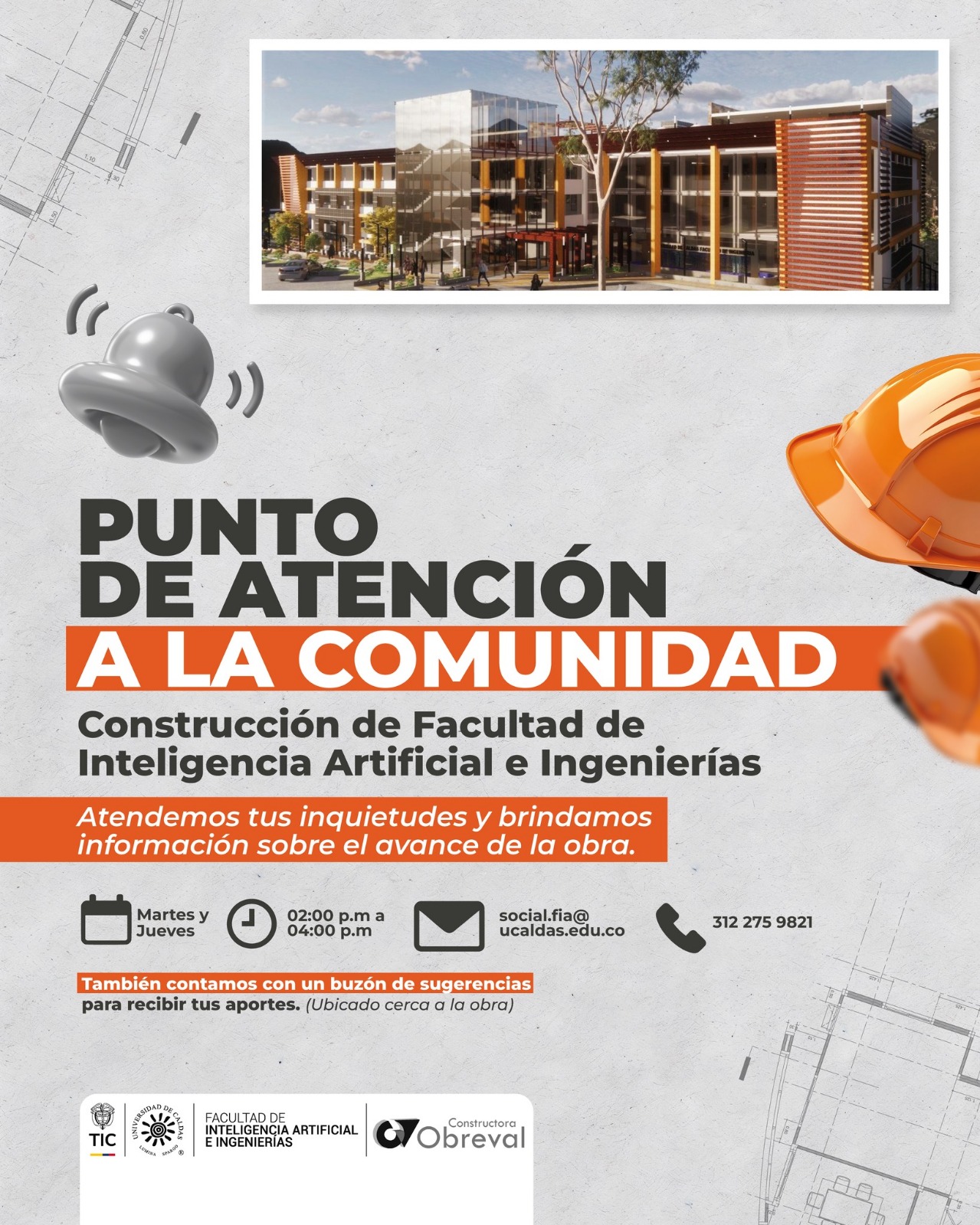 La atención se realiza los días martes y jueves, entre las 2:00 y las 4:00 de la tarde. También se encuentra habilitado el correo social.fia@ucaldas.edu.co y la línea 312 275 9821 para recibir consultas. De igual manera, a las afueras de la obra se dispuso un buzón de sugerencias para que la comunidad pueda presentar comentarios o aportes relacionados con el desarrollo del proyecto.
