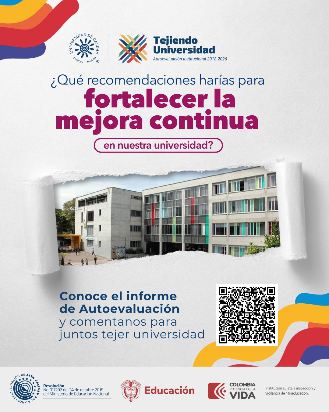 La Universidad reafirma así que la reacreditación institucional no solo mide la calidad, sino que integra las voces de toda la comunidad. Cada aporte es fundamental para seguir consolidando una universidad incluyente, participativa y de alta calidad.