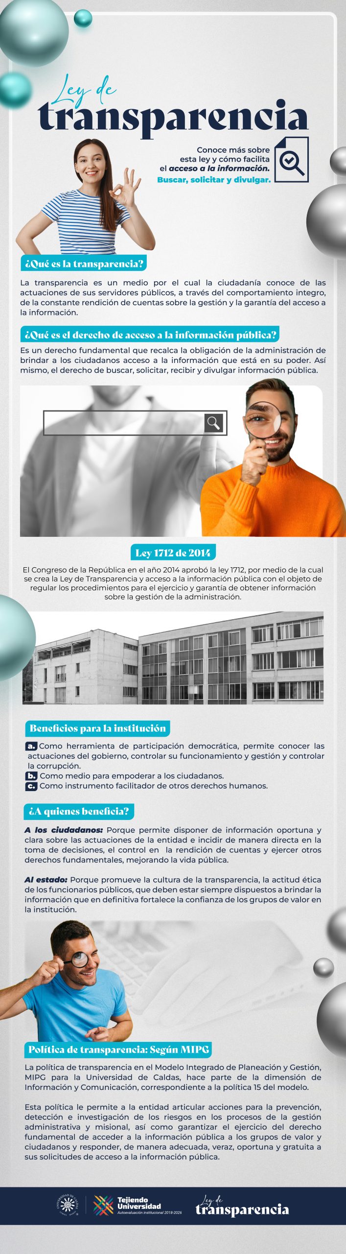 Desde la Oficina Asesora de Planeación y Sistemas, se socializa a la comunidad un tema tan importante como lo es la transparencia y la administración pública. En el ámbito universitario, la política de transparencia se enmarca dentro del Modelo Integrado de Planeación y Gestión (MIPG), en la política 15 del modelo. Esta política busca prevenir y detectar riesgos en los procesos administrativos y misionales de la institución, garantizando que los ciudadanos puedan ejercer su derecho a acceder a la información pública de manera adecuada, veraz, oportuna y gratuita.