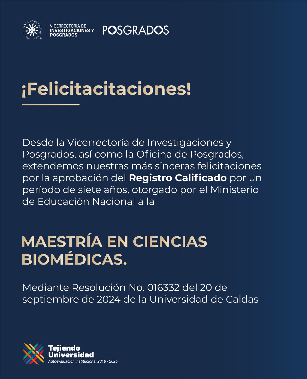 El Ministerio de Educación Nacional, a través de la Resolución N° 016332 del 20 de septiembre de 2024, aprobó la renovación y modificación del registro calificado de la Maestría en Ciencias Biomédicas en investigación, ofrecida por la Universidad en modalidad presencial en Manizales.