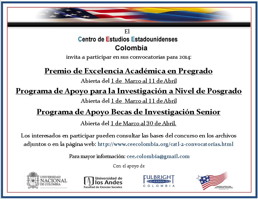 El Centro de Estudios Estadounidenses en Colombia, CEE, dio a conocer el calendario de convocatorias para el 2014. Las personas interesadas pueden inscribirse del 1 marzo del 2014 al 11 de abril del 2014 en el Premio de Excelencia Académica en Pregrado y Programa de Apoyo para la Investigación a nivel de posgrado y del 1 de marzo del 2014 al 30 de abril del 2014 en el Programa de Apoyo Becas de Investigación Senior.