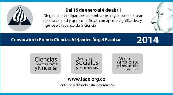La Fundación Alejandro Ángel Escobar abre convocatoria para el premio en Ciencias Exactas, Físicas y Naturales, con el fin de Incentivar y promover la investigación e innovación en todas las áreas de la ciencia, a través del otorgamiento de un premio, representado en una medalla, un diploma y una suma dinero.