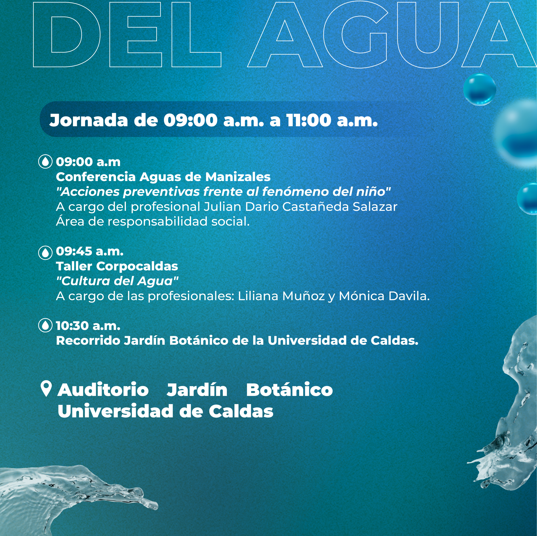 La celebración contará con la Conferencia «Acciones preventivas frente al fenómeno del niño», a cargo de Aguas de Manizales, así como el taller «Cultura del Agua» que será dirigido por Corpocaldas. Pero lo más significativo será el recorrido por el Jardín Botánico de la Universidad.