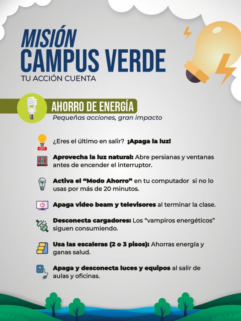 La estrategia recuerda la importancia de acciones cotidianas como apagar las luces al salir de aulas y oficinas, aprovechar la luz natural antes de encender interruptores, activar el modo ahorro en los computadores cuando no estén en uso y desconectar cargadores o equipos electrónicos que siguen consumiendo energía.