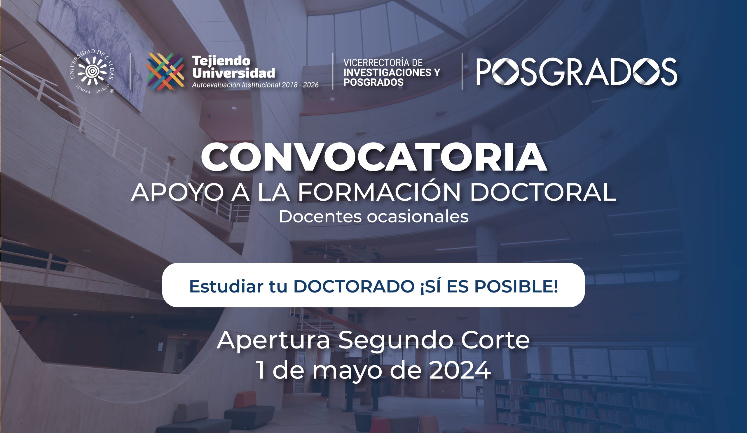 La Oficina de Posgrados de la Vicerrectoría de Investigaciones y Posgrados, ha anunciado la apertura del segundo corte de la convocatoria de apoyo a la formación doctoral destinada a docentes ocasionales de la institución. Hasta el 23 de mayo pueden hacer la entrega de la documentación en la Oficina de Posgrados