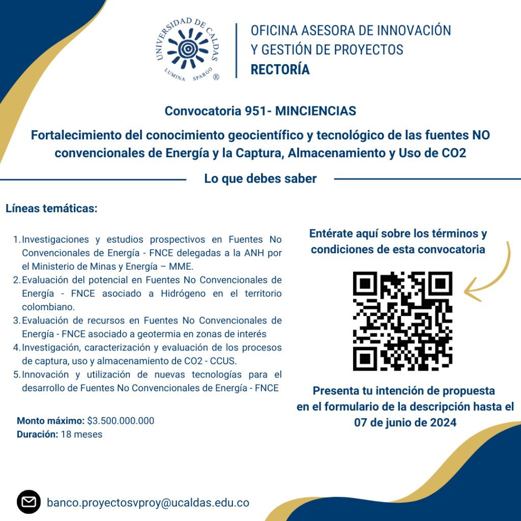 La Oficina Asesora de Innovación y Gestión de Proyectos de la Universidad de Caldas ha extendido una invitación a toda la comunidad universitaria para presentar sus intenciones de proyectos en el ámbito de la convocatoria 951 del Ministerio de Ciencia, Tecnología e Innovación.