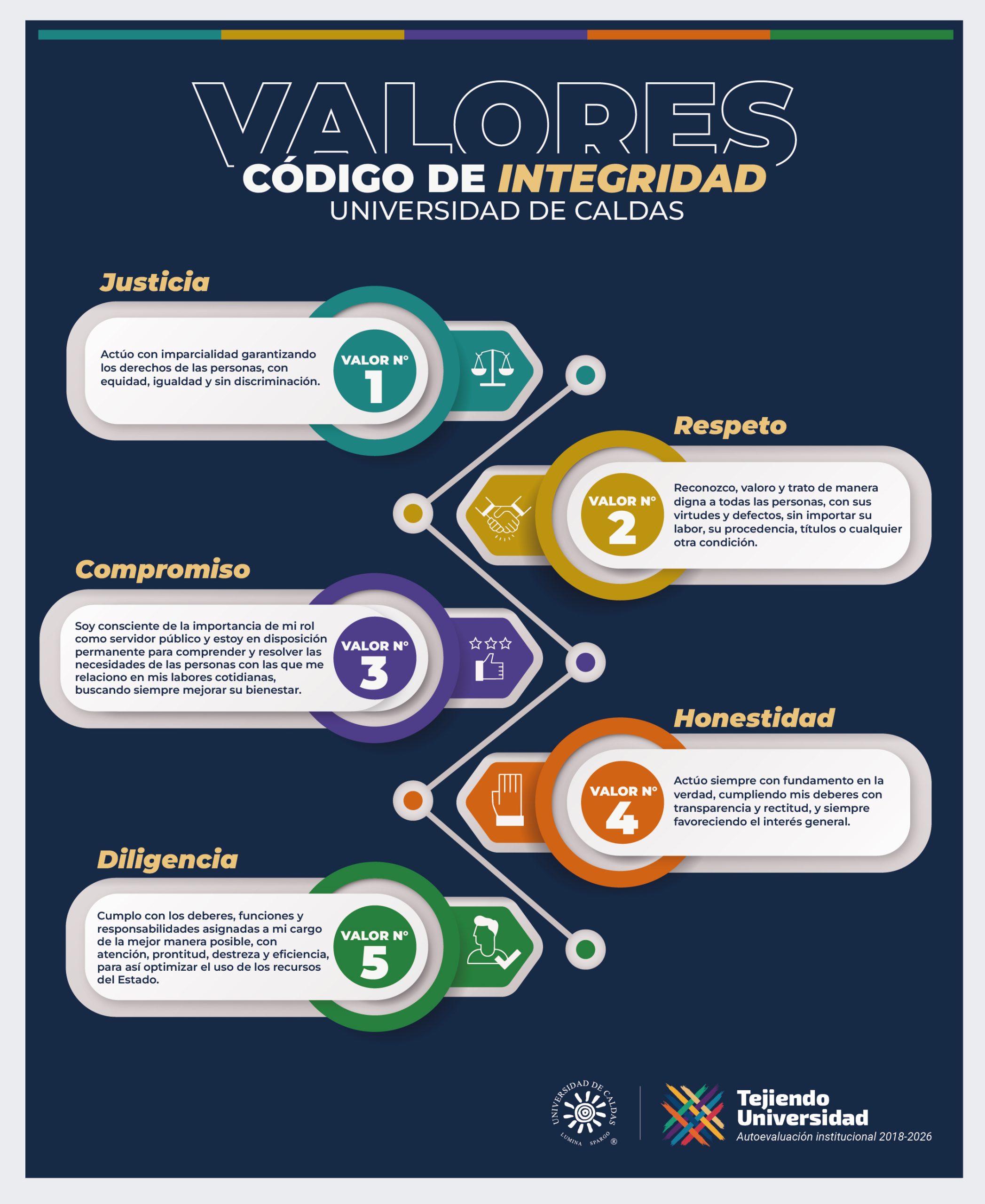 La Universidad de Caldas reitera a toda su comunidad docente y administrativa la importancia de los valores institucionales como pilares fundamentales de su quehacer diario. En este sentido, se hace especial énfasis en la adopción del Código de Integridad del Servidor Público, establecido mediante la Resolución 1239 del año 2021.
