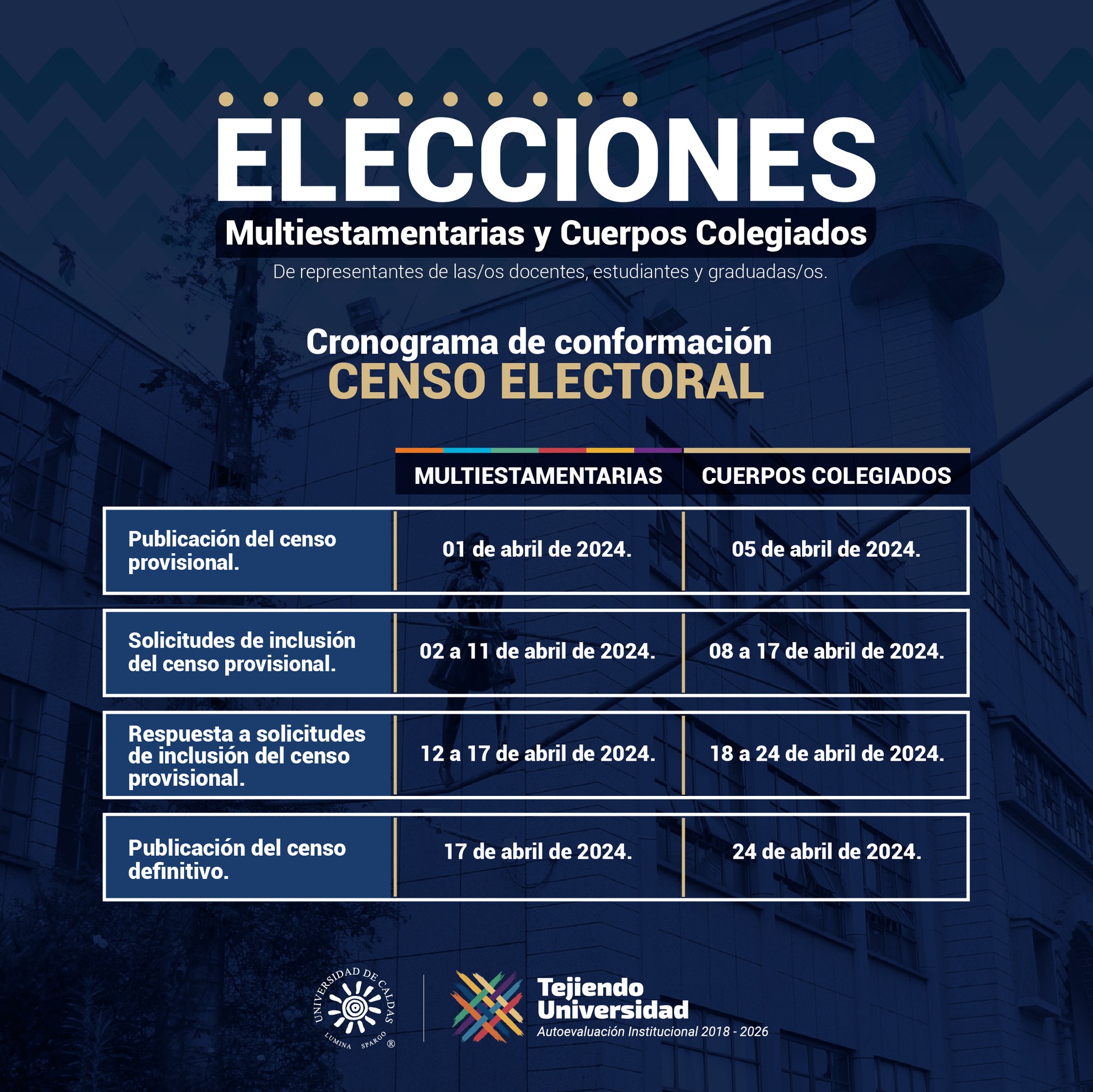 El Comité Central de Elecciones y la Secretaría General de la Universidad de Caldas recuerdan a la comunidad universitaria que se encuentran en curso los procesos de elecciones de representantes de estudiantes, docentes y egresados/as, a las Elecciones Multiestamentarias y Cuerpos Colegiados.