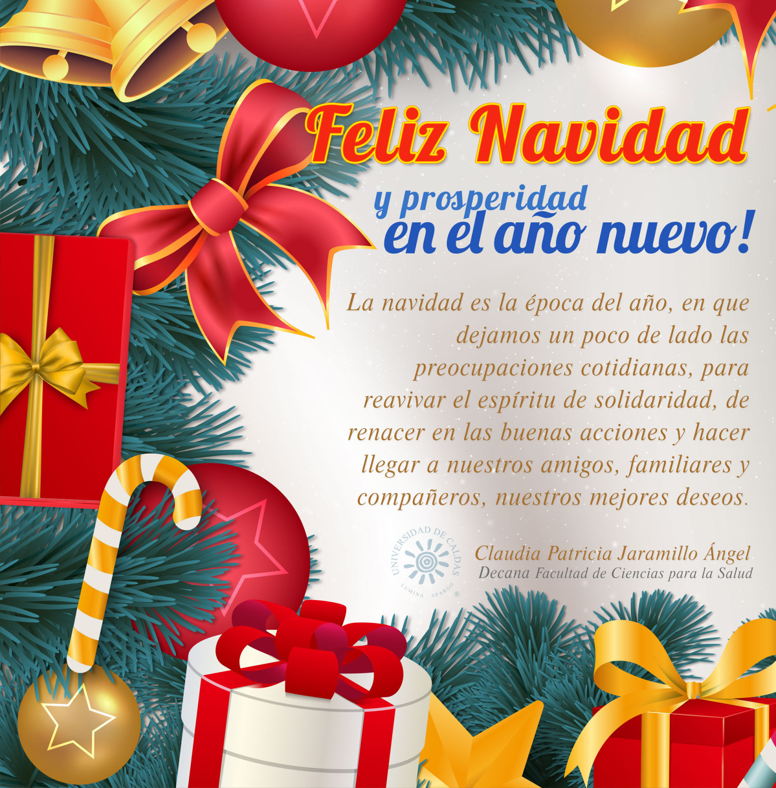 Claudia Patricia Jaramilo Ángel, Decana de la Facultad de ciencias para la Salud, comparte con su equipo de trabajo y con la comunidad universitaria en general un caluroso saludo navideño.