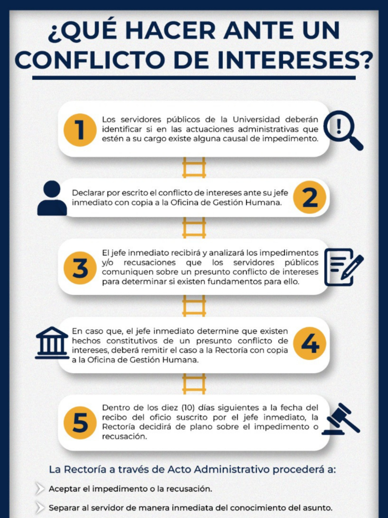 La Universidad reafirma su compromiso con la ética pública y la transparencia institucional. Por tal motivo, invita a toda la comunidad universitaria a conocer y aplicar el Instructivo para la Declaración de Conflictos de Interés, una herramienta clave para fortalecer la integridad en el ejercicio de las funciones públicas.