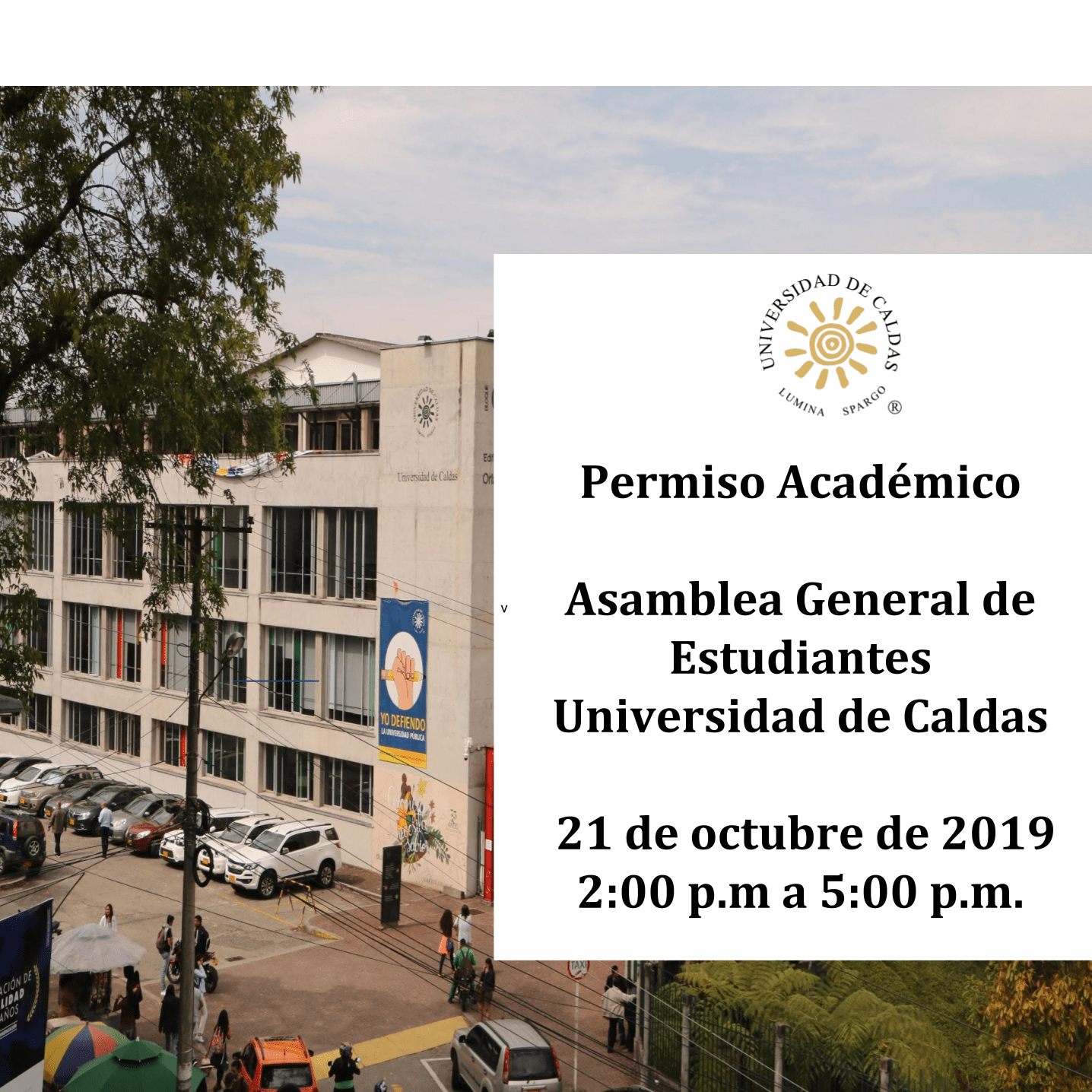 Mediante circular 022 del 21 de octubre de 2019, la Vicerrectoría Académica de la Universidad de Caldas, anunció permiso académico para los estudiantes con motivo de la asamblea que se realizará el día de hoy entre las 2:00 p.m. y las 5:00 p.m.