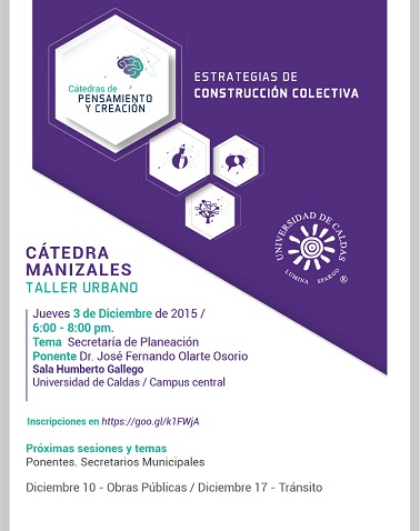 Descripción: encuentro que tiene como objetivo la construcción de una visión colaborativa de ciudad a partir de perspectivas administrativas y académicas, desde la Alcaldía de Manizales y la U. de Caldas.