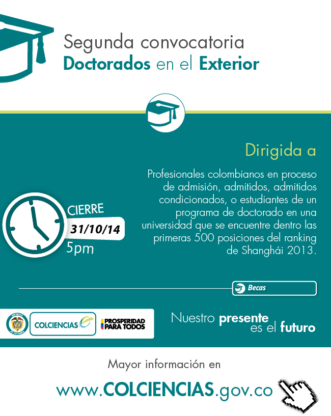 La Universidad de Caldas invita a los Profesionales en proceso de admisión, admitidos, admitidos condicionados o que se encuentren estudiando un programa de doctorado de alto nivel académico en una universidad en el exterior, para que para que participen en la Segunda Convocatoria Doctorados en el exterior 2014 de Colciencias. Continue reading