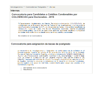 La Vicerrectoría de Investigaciones y Posgrados de la Universidad de Caldas y Colciencias tienen abierta la convocatoria interna para la selección de candidatos elegibles a la asignación de créditos educativos condonables, otorgados por Colciencias para el 2016.
