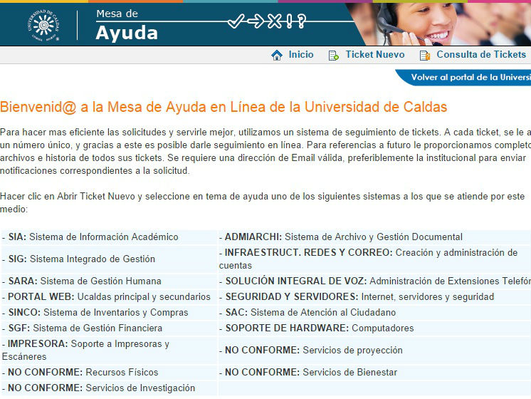 El Webmáster de la U. de Caldas explicó: “este es un sistema permite recibir solicitudes en línea, donde el sistema genera un ticket -unnúmero aleatorio- y el usuario inmediatamente recibe en su correo electrónico. El ticket queda abierto y el administrador de cada tematiene 24 horas para atender esa solicitud. El número queda cerrado cuando la inquietud se resuelve”.