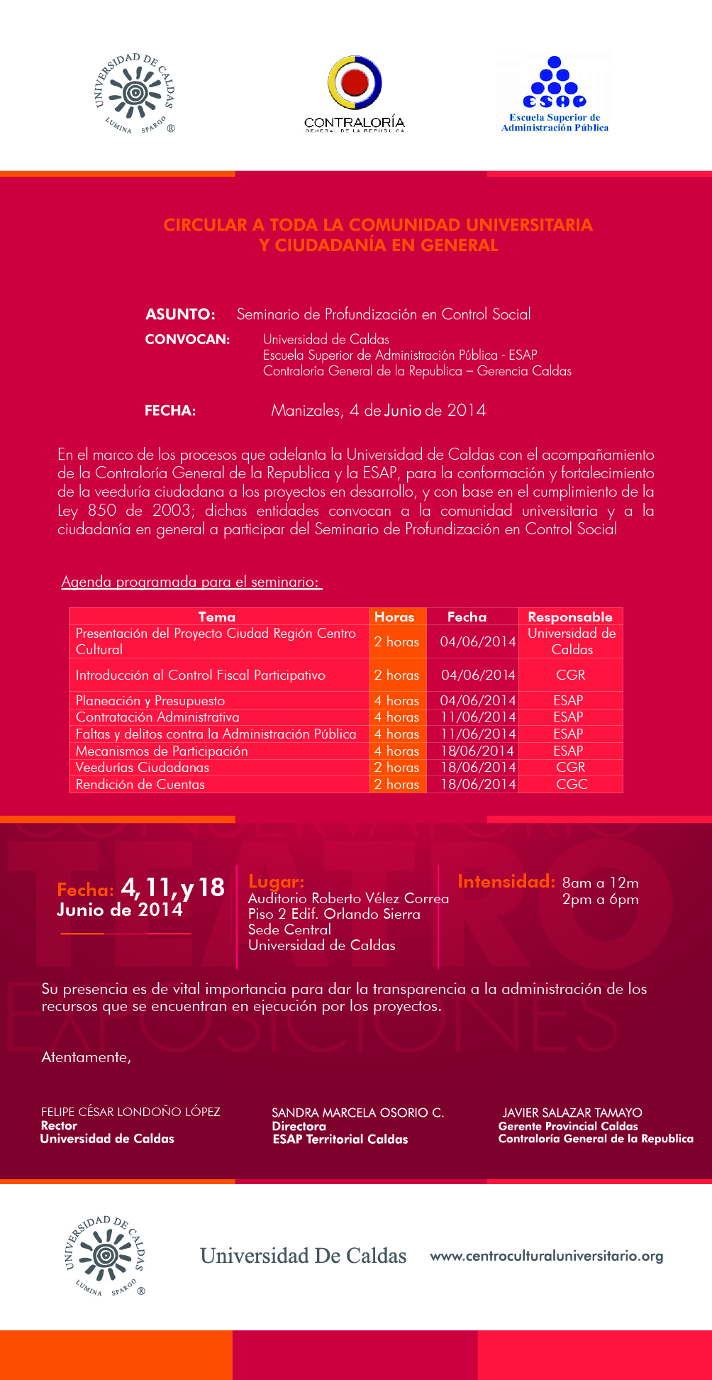 La Universidad de Caldas, la Escuela de Administración Pública (ESAP) y la Contraloría General de la República sede Caldas, invitan a toda la comunidad universitaria y a la ciudadanía en general a participar en el Seminario de Profundización en Control Social, que se realizará los días 4, 11 y 18 de junio del 2014 en el Auditorio Roberto Vélez Correa, Edificio Orlando Sierra de la Institución.