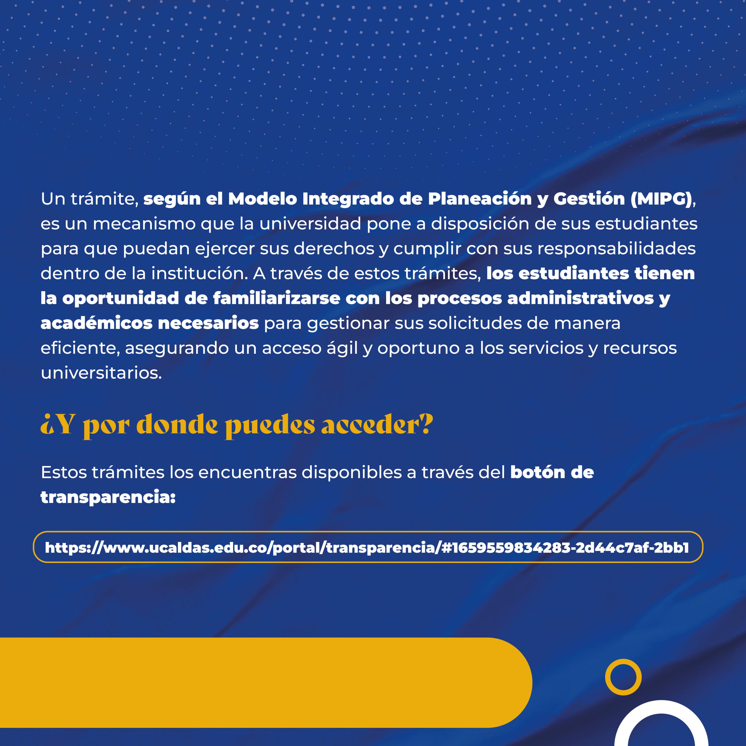 Además de una respuesta más rápida a sus solicitudes, los trámites en línea ofrecen beneficios clave: reducen la necesidad de desplazamientos y el ahorro de tiempo, contribuyendo a una experiencia estudiantil más cómoda y efectiva. La comunidad universitaria puede acceder a estos servicios a través del portal de transparencia de la Universidad de Caldas en el sitio web institucional, donde encontrará un botón dedicado a los trámites que garantiza su accesibilidad.
