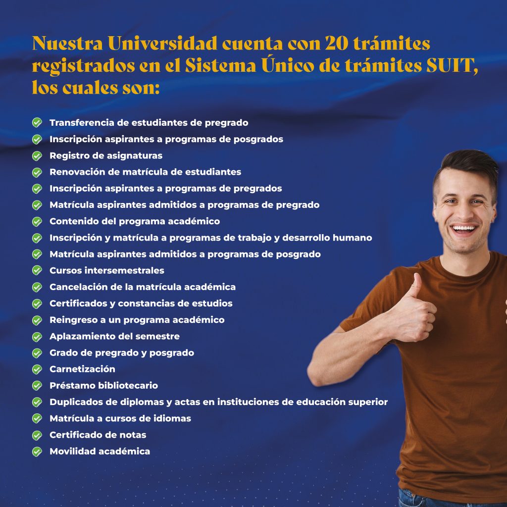 En un compromiso con la excelencia académica y la eficiencia administrativa, la universidad ha lanzado una campaña informativa sobre los diversos trámites disponibles para estudiantes a través del Sistema Único de Información de Trámites (SUIT). La iniciativa busca fortalecer la gestión autónoma de los estudiantes al ofrecerles acceso ágil y directo a una serie de procedimientos fundamentales para su vida universitaria.
